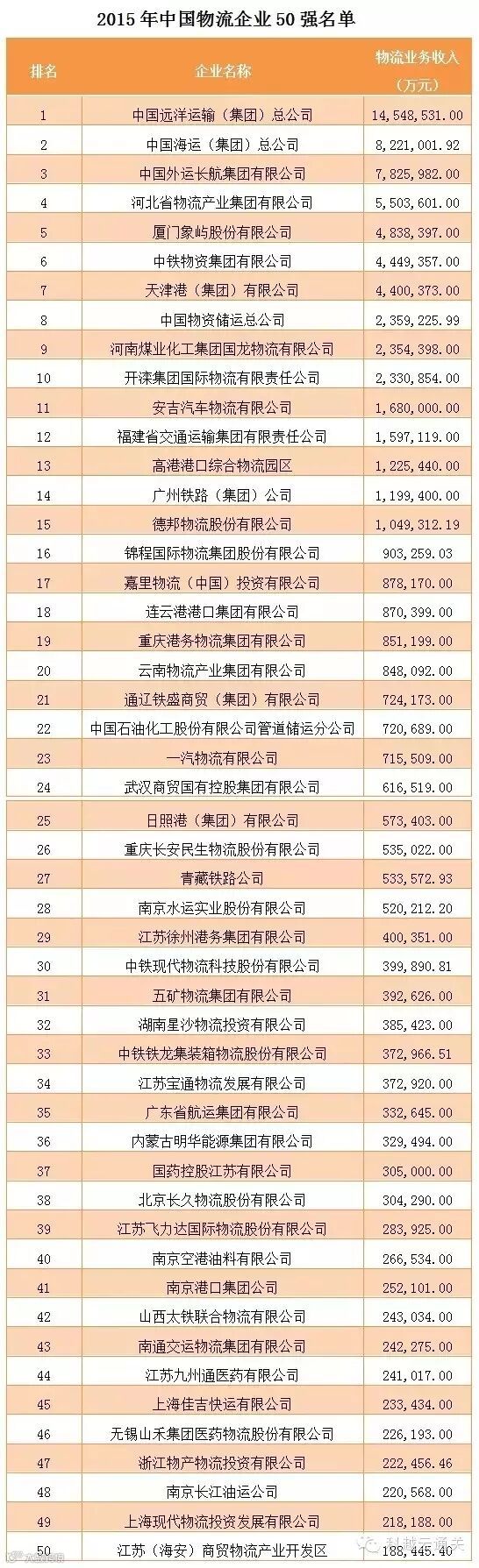2015中国物流企业50强榜单出炉