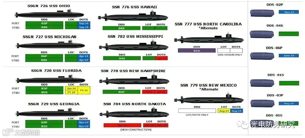 2014年的一张简报幻灯片显示,美国海军潜艇被配置用于特种作战能力的支持,并配备了DDS和备用艇,据了解,自那以后,这些潜艇没有任何显著增长。这凸显了它们的可用性有限。