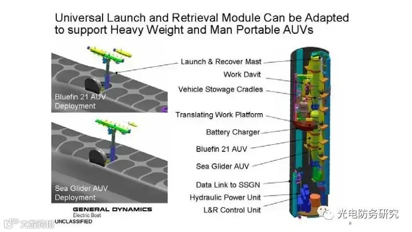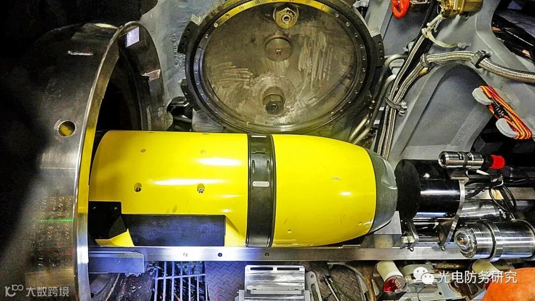 弗吉尼亚级潜艇特拉华州号(USS Delaware)上的一个装有“黄色马里”无人潜航器(Yellow Moray UUV)的罐子,如右图所示,这是该系统最近端到端测试的一部分。