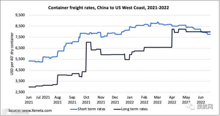 运价基准平台Xeneta跟踪合同运价和现货运价数据。该平台首席分析师Peter Sand表示,自6月4日以来,至美西的跨太平洋航线现货运价一直低于长约运价。Xeneta的数据显示,目前该航线的现货运价为7768美元/FEU,比长约运价低2.7%;长约运价为7981美元/FEU,同比飙升了159.9%。