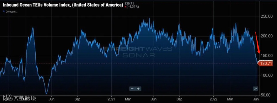 FreightWaves报告称,最新海运集装箱预订数据显示,尽管2022年前5个月美国进口货物数量表现强劲,但进口需求不仅在放缓,而且正在急剧下降。由于跨太平洋地区的运力保持相对稳定,Freightos指数显示,从中国到美国西海岸的集装箱即期运价环比下降38%至9,630美元。