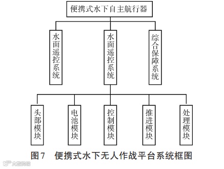 便携式水下自主航行器一般由水面遥控系统、潜航体和综合保障系统组成,其中水面遥控系统主要完成人机交互、任务装定、路径规划、探测结果下载、数据分析以及对潜航体的水面遥控;综合保障系统主要用于潜航体的装配维修、包装、运输防护、水声通信和定位以及布放回收;潜航体按模块化设计由头部模块、电池模块、控制模块、推进模块及处理模块组成。便携式水下自主航行器系统组成如图7所示。
