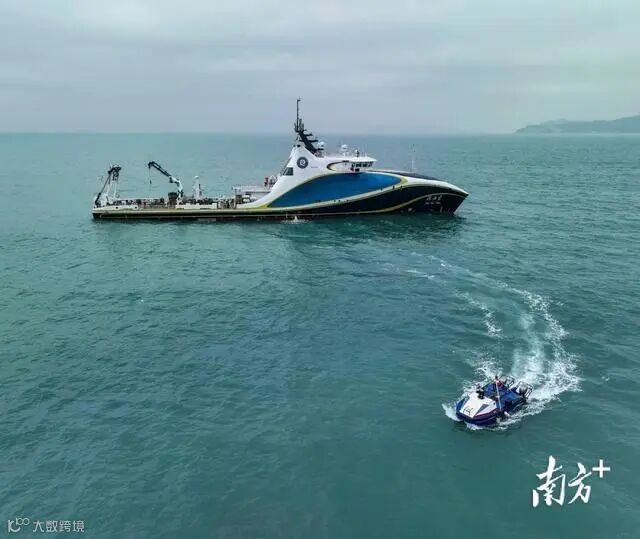 近日,一场防台风综合演习在珠海金湾风电场水域进行。南方海洋科学与工程广东省实验室(珠海)(下称“南方海洋实验室”)派出搭载无人艇、无人机的全球首台智能型无人系统科考母船“珠海云”,实时拍摄现场画面、分析漂移路径,助力快速找到落水人员。