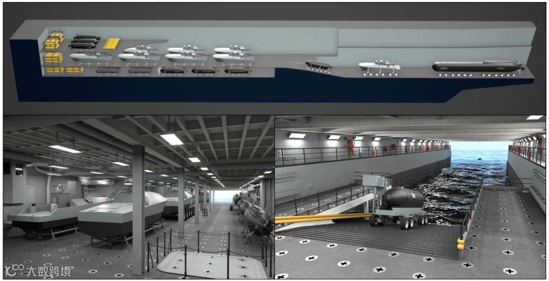 ③ 大型无人潜航器(LDUUV)和超大型无人潜航器(XLUUV)续航力和有效载荷更大,可长时间执行勘测任务,并部署SUUV或水雷。LDUUV和XLUUV可以从码头或其它有合适甲板设备的船只上部署。