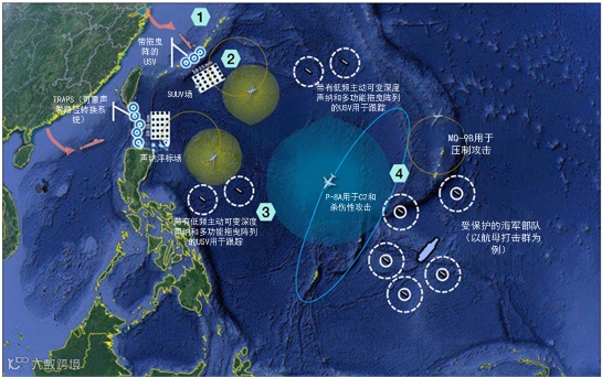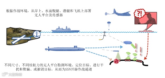① 各大国加强了其海底防御,并利用地理优势,构建了装备有固定和移动水声/非水声传感器的堡垒区,再辅以飞机和水面舰艇,能够突袭目标或部署密集的水雷。这有可能击败美国的海底作战,阻止美国潜艇执行关键任务。