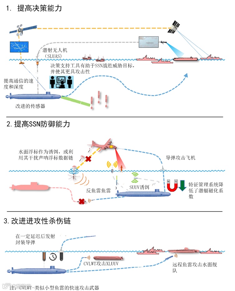 为了攻入对手堡垒区,美国提出,需要提高其SSN的作战能力,包括以下三点:提高决策能力、提高SSN防御能力、改进进攻性杀伤链,如图4所示。