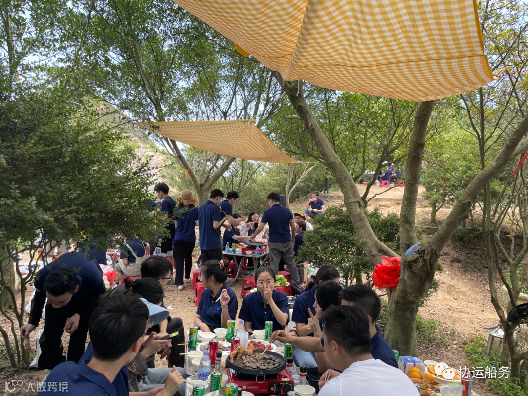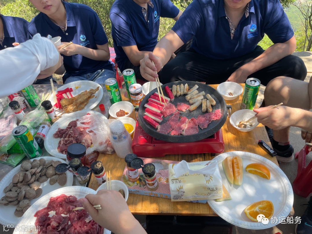 暖烘烘的阳光透过树叶间的缝隙,在人们身上留下斑驳的光影。男生上树,将野餐布巧化成遮阳布,谢绝盛夏的美意。女生将牛肉,猪肉,花甲进行冲洗。所有食材摆放整齐后,我们的野炊之旅正式开始。