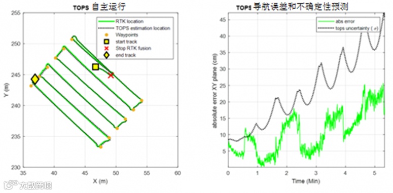 在校准阶段的第1个人工控制航行任务中,TOPS融合系统使用RTK GPS。此后, TOPS融合引擎不再使用RTK GPS,仅作为评估TOPS性能的参考。TOPS以200 Hz的频率实时运行,并估算了位置和位置不确定性。