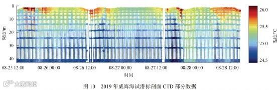 图10所示为2019年8月在山东威海褚岛海域进行的海上试验中获取的剖面CTD部分数据。潜标结构为半潜式结构,在浮力材料的作用下悬浮在距水底10m左右距离。潜标累计运行76h,高频次累计进行了163次剖面观测,获取了43005条CTD数据,数据接收的完整率达到98.16%,初步验证了潜标控制系统的可行性与稳定性。