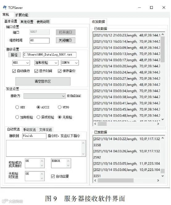 海上通信常常发生中断,为了提高服务器数据获取率,需要建立数据补发机制,这就要求必须建立双向通信协议,开发服务器接收软件。如图9所示,本文以Visual Studio 2019为开发平台,开发出了一套服务器接收软件。软件兼容CDMA模块、铱星通信模块和4G通信模块的通信协议,并自动过滤协议相关内容,保留原始格式的数据信息,将数据完整存储到本地文本文档和数据库当中。