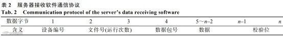 潜标发送的数据包包含设备编号、文件号、数据包号、数据和校验位信息,其含义如下:设备号即每台设备单独的编号,最大不超过255;与文件号对应的是潜标的运行次数,由于通信模块一次性最大发送数据量有长度限制,因此潜标每次唤醒都会新生成一个数据文件,避免数据文件过于庞大;数据包号的高4位指的是当前数据文件的总数据包的数量,低4位是当前数据包的编号,当数据文件长度超出通信模块最大发送长度时,就把数据文件截断成多个数据包,后期根据文件号和数据包号来进行拼接;数据包从第5字节一直到第n–2字节(n是数据包总字节数)是潜标获取的数据,其长度和内容并不固定;数据包最后两字节是加和校验位,高位在前低位在后。