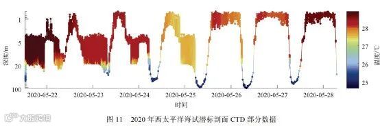 搭乘“向阳红19”号科考船,该型潜标于2020年5月21日成功布放于西太平洋海域进行试验,并于5月28日成功进行了回收,布放点水深约5500m左右。潜标搭载剖面CTD1台,国家海洋技术中心研制的感应耦合式传感器10台[20-21]、中国科学院声学研究所研制的75kHzADCP1台。图11所示为海上测试期间获取的剖面CTD的部分数据。经统计,服务器共接收到339组数据,其中有15组重复数据,潜标共运行333个完整观测周期,服务器数据获取率达到97.3%。数据中可以看到,受到海流的影响,水下驱动装置和垂直升降装置的深度会上下起伏,起伏深度超过了100m。当强流出现时,两者均出现下压现象,水下驱动装置释放通信缆也无法使垂直升降装置上浮到海面,而当海流减弱时,通信缆发生松弛,仍旧无法正常进行剖面升降运动。