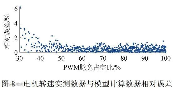 图8所示是电机转速实测数据与模型计算的数据之间的相对误差,占空比小于30%时误差较大不予考虑,当脉宽占空比在30%~40%时,模型计算出的Sk与实际测量得到的数据相对误差约在4%以内,当占空比超过40%,两者相对误差在2%以内。为实现电机动力输出效率最大化,正常情况下PWM脉宽占空比最大值一般选在70%~75%左右,因此能够很好的检测电机堵转的情况。