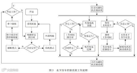 水下绞车控制系统系统工作流程如图5所示,系统上电后首先进入一分钟倒计时的睡眠模式,该模式下既可以降低功耗,又可以完整接收串口指令。如果在倒计时一分钟内未收到任何指令,控制系统将关闭图3中除DC-DC模块和MCU1模块外的所有外围设备的电源进入待机模式,此时待机电流约0.86mA,年待机消耗电量约7.53Ah。当潜标开始工作时,剖面数据采集装置通过通信缆将水下驱动装置进行外部唤醒,水下绞车控制系统开始启动,当接收到开始工作的控制指令时便开启BLDCM控制系统。