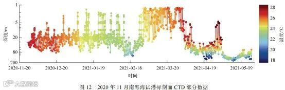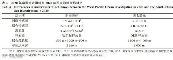 2020年11月20日,搭乘“向阳红14”号科考船,再次将该型潜标布放于南海西北部,布放点水深2366m,并于2021年5月27日搭乘海洋地质4号科考船对该潜标进行了回收,此次布放的潜标与2020年5月在西太布放的潜标对比如表3所示。经统计,潜标系统共计在位运行187d,剖面测量实际工作周期为753次,共计获得6524条水下驱动装置数据、23227条抗污染CTD数据、130391条感应耦合传感器数据、18036组ADCP数据和2823组ACM数据。受海流影响,水下驱动装置深度在40m至180m深度之间,剖面平台CTD最深位置到达到了165m。