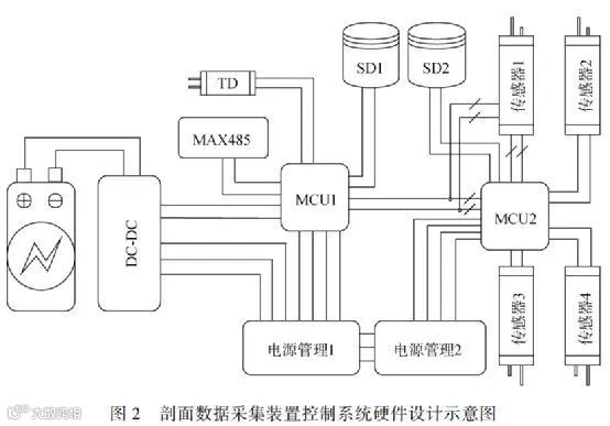剖面数据采集装置电路上设计有2片MCU、2片SD卡和2处电源管理部分。其中MCU1作为主控制单元,直接控制SD1、电源管理1和MCU2,MCU2作为副控制单元,只控制SD2、电源管理2和所搭载的传感器。工作时,MCU2将所有传感器读取到的数据存储到SD2当中作为原始数据的备份,之后将这些数据通过串口通信的方式发送到MCU1,MCU1将数据存储到SD1中。如果剖面数据采集装置只搭载一台传感器,那么可以将其连接到传感器1的接口,直接通过跳线连接到MCU1,就可以忽略掉MCU2、SD2和电源管理2的电路部分,极大简化了剖面数据采集装置的硬件连接。