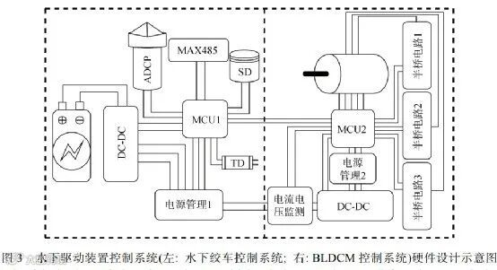 水下驱动装置控制系统硬件设计如图3所示,主要分为水下绞车控制系统与BLDCM控制系统两部分,主要由电池组、DC-DC电源模块、TD传感器、485通信模块、MCU、SD卡、电源管理部分、ADCP接口、电流电压监测器、全桥逆变电路、BLDCM等组成。电池组采用了34615型锂电池,以7串54并方式进行连接,电压25.2V,电量为756Ah;DC-DC模块采用MP4462降压芯片,输入电压最高为36V,输出5V,最大输出电流为3.5A,静态电流120µA;ADCP接口可搭载中国科学院声学研究所研制的ADCP[16-18],可通过串口将ADCP唤醒,读取最新测得的海流数据;电流监测芯片采用了ACS712-20芯片,量程为±20A,它通过霍尔效应将电流信号直接转换为模拟电压信号对外输出,精确度达到1.5%;电压监测直接使用分压电阻接入MCU内置的模数转换器(analogto digital converter, ADC)进行转换;全桥逆变电路采用3片IR2101半桥芯片和6片N沟道IRF1405型MOSFET,MOSFET最大导通电流169A,远远超出电机额定电流,能够有效解决功率芯片在密闭空间散热不足的问题;BLDCM额定电压24V,额定功率200W,满足潜标剖面运动的功率需求。其余部分与剖面数据采集装置硬件设计基本一致,这里不再赘述。
