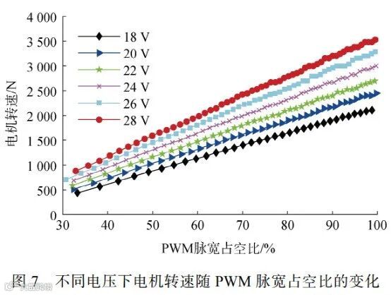 首先测定剖面数据采集装置净浮力,然后在实验室将水下驱动装置加以净浮力两倍的恒定拉力,接着调整供电电压启动电机,将PWM脉宽占空比与电机的转速记录下来并进行二次函数拟合,然后调整供电电压并记录数据再次拟合,最终得到了在不同电压下电机转速与PWM脉宽占空比的函数关系模型: