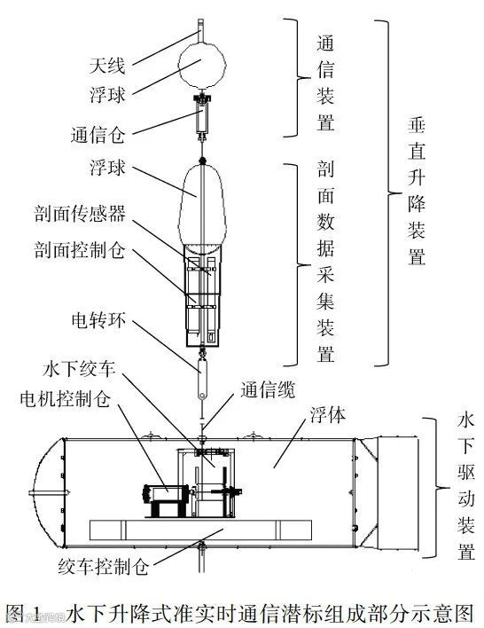 如图1所示,该型潜标主要包括垂直升降装置和水下驱动装置两大部分。水下驱动装置悬浮于水面下一定深度或者坐底于海底,水下驱动装置释放通信缆,垂直升降装置在浮力的作用下缓慢上浮,在上浮期间利用搭载的传感器连续进行剖面数据的采集与存储,到达海面后通过通信装置将获取的数据以无线通信的方式发送到岸基服务器,实现垂直剖面要素的连续观测与数据的准实时传输,通过建立潜标与服务器之间的双向通信协议,实现对数据的补发和对潜标的远程控制。数据传输完毕后,垂直升降装置下潜到水面下进行休眠以降低功耗。该方案具有一定的隐蔽性,能够降低潜标受到人为和自然破坏的可能性,同时由于水面下光强较弱,且剖面传感器采用了国家海洋技术中心抗污染CTD[14],能够大幅减小生物附着问题对仪器设备造成的负面影响,从而实现长期、连续、定点、低成本的上层海洋剖面观测。