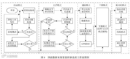 考虑到潜标在海面受到风、浪、船只以及人为破坏的可能性比较大,且在水面下光强较弱,能够在一定程度上减小生物附着问题,因此设计方案优先考虑将潜标整体均潜伏于海面下一定深度,只有在通信时才会浮出水面。如图4所示,剖面数据采集装置控制系统工作流程主要有启动模式、上浮/下潜模式、通信模式和低功耗模式。启动模式下控制系统首先进行初始化,再进行参数配置,从SD卡读取并设置潜标的工作周期、剖面运行深度、设备编号、传感器类型、服务器IP地址和端口等参数。随后根据启动方式的不同从而执行不同的任务,如果是上电重启,即人为的启动潜标,则先进行潜标各项功能的检查,包括存储器测试、水下驱动装置通信测试、水下电机测试,传感器测试、GPS测试、远程通信测试等等工作,在潜标布放完毕后,系统进行重启,随后进入上浮模式。