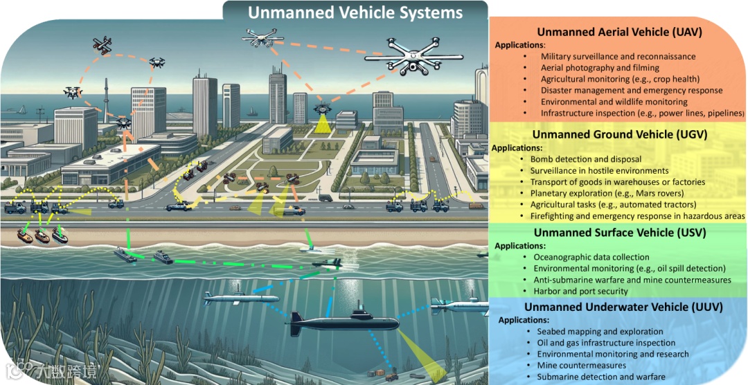 近年来,无人系统(UVs)已成为一种颠覆性技术,为日常生活的各个领域带来了革命性的变化,其应用范围从包裹递送、民用物联网(IoT)到军事用途。具体来说,无人车指的是可以在有限或无人干预的情况下运行的车辆、设备或机器,例如,车上没有人类驾驶员或机组人员。得益于这一特殊属性,UV 可用于在具有挑战性或危险的环境中执行任务。一般来说,无人系统可分为无人飞行器(UAV)、无人地面车辆(UGV)、无人水面航行器(USV)和无人水下航行器(UUV)。正如其名称所示,每种无人系统都是为特定任务和环境而设计的。例如,UAV 被广泛用于航拍、环境和野生动物监测以及监视,而 UGV 则可用于运输和炸弹探测等任务。不同的是,USV 和 UUV 分别用于水面和水下作业,包括海洋学数据收集、水下勘探和潜艇监视。