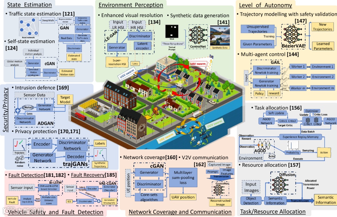 增强 UV 的自主性对其独立和合作的集群行动至关重要。GAI 的生成能力应用于多个方面,从生成新轨迹到完善路由策略,以及在不同场景中模仿智能体的路由行为。这些多样化的应用展示了动态和适应性强的解决方案,对于 UV 在复杂多变的环境中高效、独立地导航和运行至关重要。
