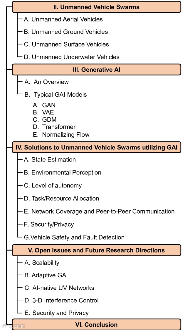 本文的整体结构如图 1 所示。第二节介绍了 UV 集群的基本原理。第三节深入概述了不同的 GAI 技术及其优势。然后,第四节深入探讨了 GAI 在 UV 集群新问题中的应用。第五节强调了 GAI 在UV集群中的未决问题和未来研究方向。此外,表 I 列出了本文中使用的所有缩写。