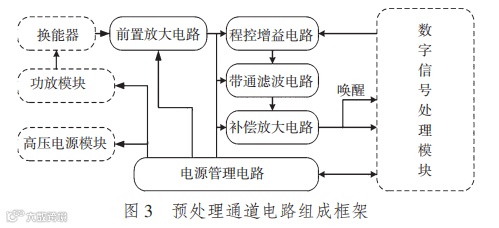 接收预处理通道电路由电源管理电路及接收通道电路组成,其中电源管理电路分别控制数字信号处理模块、功放模块、高压电源模块的供电开关。通过对各个功能模块的供电时序的控制,有效防止设备故障,同时降低设备待机功耗。接收通道电路由值班唤醒电路、前置放大电路、增益控制电路、带通滤波电路以及补偿放大电路组成 [5]。通信机具备待机功能,电路接收远程水声信号,触发唤醒功能。针对不同距离的环境,接收电路可实现多档增益选择。预处理通道电路的组成框架如图 3 所示。