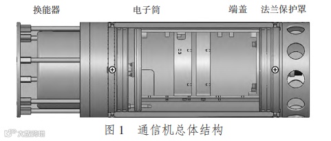 水声通信机由通信换能器、电子系统以及耐压壳体 3 大部分组成。其中,耐压壳体包含外部金属壳体、保护罩及内部骨架,换能器通过转接结构与壳体相连。总体结构如图 1 所示。