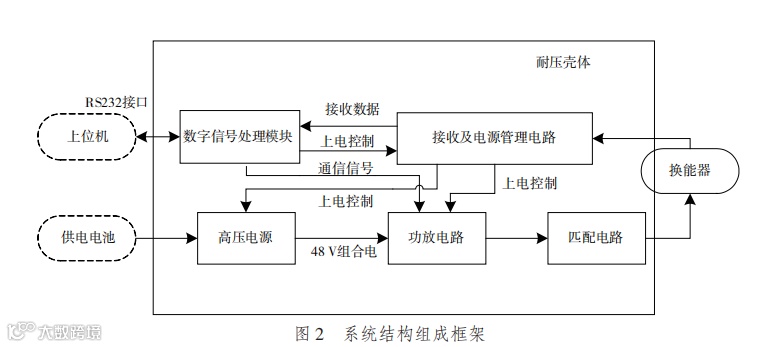 电子系统由高压电源、功放电路、匹配电路、接收及电源管理电路以及数字信号处理模块组成。数字信号处理模块接收处理控制指令或数据,生成通信编码信号,经功放电路和匹配电路送至换能器,发射通信信号。接收电路接收远端通信信号,经数字信号处理模块进行解码处理,生成回送指令或数据。电源管理电路对各个功能模块进行上电控制。系统结构组成如图 2 所示。