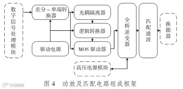 功放电路主要完成水声通信信号的功率放大。从功放效率和使用的成熟度上考虑,选用 D 类 PWM开关功放电路。功放电路的设计主要包括 3 个部分,即信号转换驱动电路、功率放大电路以及电源控制电路。从体积、电压转换效率考虑,功率放大电路采用全桥电路。信号转换驱动电路主要对传输信号进行隔离转换,对驱动电流进行设定。电源控制电路主要对驱动器输出电源、驱动器输入 /光耦输出电源、光耦输入电源分 3 级进行设计。匹配电路主要是对换能器阻抗匹配和功放电路输出电压进行转换,提高功放输出效率,对输出信号滤波,提升输出信号质量。考虑宽带输出,选用低通滤波器,采用并联匹配方式。根据相关公式,代入换能器测量参数,可计算得到匹配电路关键元件的参数值。变压器及电感器预留了多种抽头参数,可根据实际测试情况进行调整。功放及匹配电路的组成框架如图 4 所示。