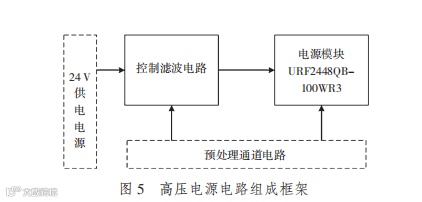 高压电源电路主要是为功放电路提供持续、稳定、高效的电压源,从功耗角度来看,需要对高压电源模块进行管理控制。为了保证整机的待机功耗,将在 URF2448QB-100WR3 电源输入端加上由 MOS管搭建的负载开关。在不使用该电源模块时,切断URF2448QB-100WR3 电源模块的输入电压,从而降低电源模块对整机待机功耗的影响。高压电源电路的组成框架如图 5 所示。