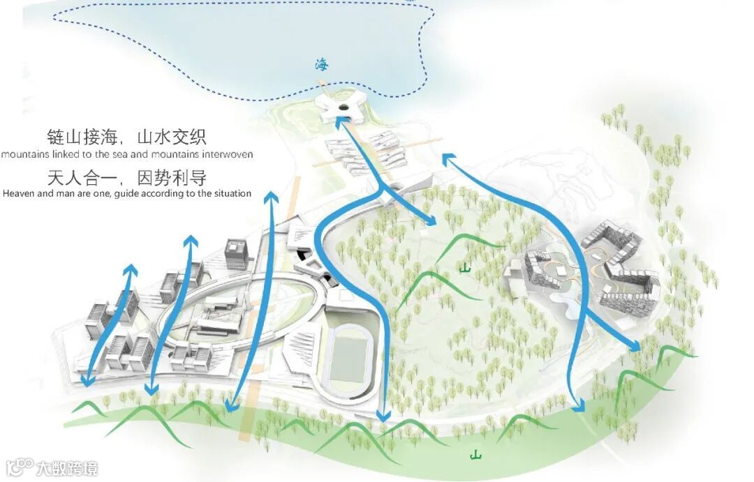 该方案强调“链山接海,山水交织的在地型社区”,探索与自然和谐共处、提升建筑环境舒适度的设计理念。整体规划布局打造山海通廊,校园建筑和景观与周边的山海自然环境相结合,以山海为主题,运用海洋元素和特征进行设计,创造出一种自然流动、亲近宜人的校园微气候,将校园与周围的环境融为一体,使山海与校园形成有机的整体,增强海洋文化内涵。