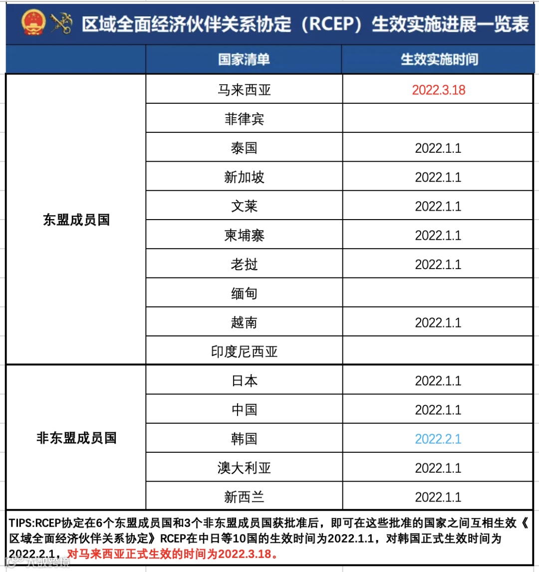 2022年1月28日,海关总署发布2022年第13号公告:《区域全面经济伙伴关系协定》将于2022年3月18日起对马来西亚生效实施。
