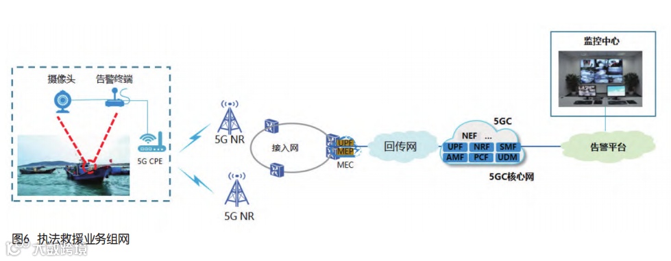 同时,5G网联无人机可搭载高清摄像头、远程IP喇叭等设备,在进行巡查时,摄像头将现场视频通过5G无线网络动态传输到岸边机房部署的MEC,再通过光纤回传到监控中心。执法人员通过摄像头对现场违法行为拍照、取证,并可通过IP喇叭对现场人员进行远程信息播报。执法救援业务组网如图6所示。