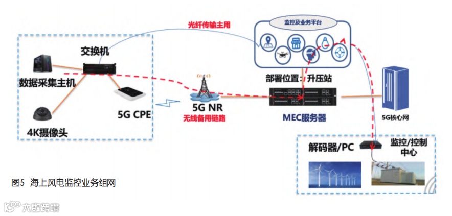 随着技术的不断演进,海上风电场逐渐走向深海,随之而来的高速通信保障成为一大难题。同时,海上风电特殊的环境与部署技术,也给运维带来了作业难、成本高、响应慢等困难。通过在沿海岸边建立高站,结合超远覆盖、载波聚合等创新技术,可满足风电场运维人员的基本通信需求。同时借用风电场的光电复合缆解决信号回传问题,在升压站部署5G设备、在风车内搭建4G/5G室分系统,可实现高速5G信号无缝覆盖,助力海上风电场引入高清视频监控、5G无人机巡检、AR远程协作、特种作业机器人等创新应用,减轻了人工运维的压力并降低了成本。海上风电监控业务组网如图5所示。