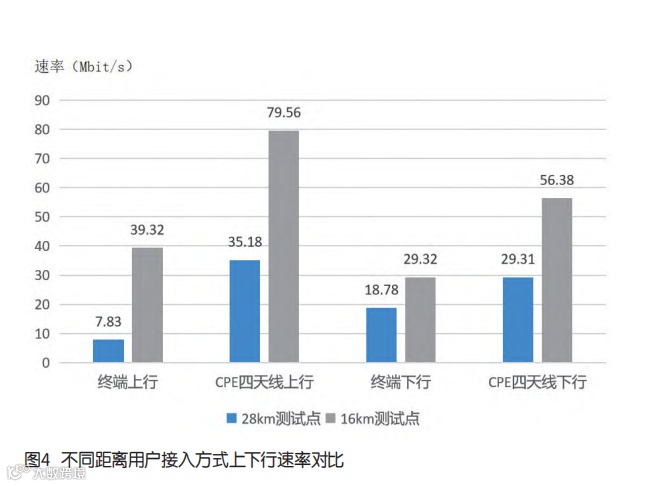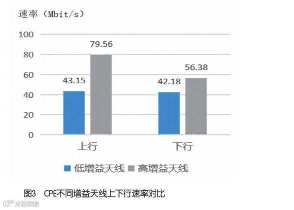 CPE高增益天线上下行速率对比如图2所示,CPE不同增益天线上下行速率对比如图3所示,不同距离用户接入方式上下行速率对比如图4所示。测试结果有如下结论。