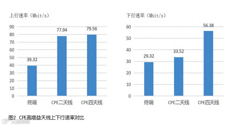 2.CPE外接四根高增益天线相比手机直接接入,上下行业务速率翻倍。