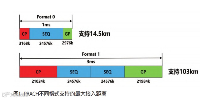 超远距离无线覆盖的最终目的是要保证覆盖范围内的终端能够正常接入。3GPP在5G R15标准中定义了随机接入前导格式,不同的随机接入前导格式决定了一个PRACH(Physical Random Access Channel,物理随机接入信道)占用的时域资源及小区的覆盖范围。如图1所示,根据3GPP标准规定,中国移动NR 2.6GHz只能支持PRACH Format 0格式,支持的最大接入距离为14.5km;若针对PRACH Format 0中GP(Guard Period,保护时隙)进行定制,NR 2.6GHz可拓展至支持最远59km接入,目前业界主流厂家均对此功能展开了相应研究与应用。而相比之下,移动NR 700MHz支持修改为Format 1格式,能够实现103km的最大接入距离,满足海面超远覆盖要求。