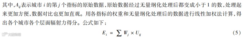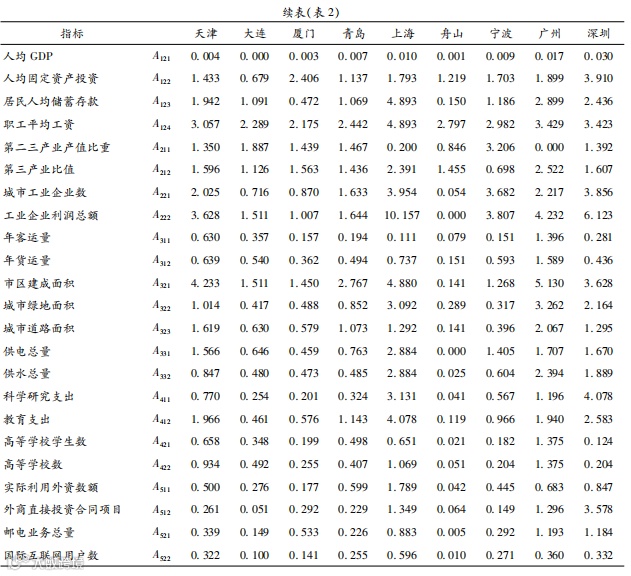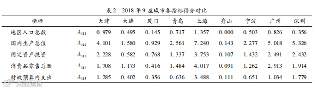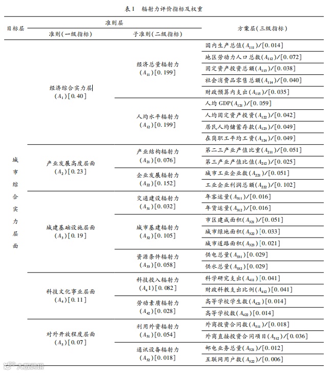 “全球海洋中心城市”这一概念对城市的主要要求有两个:第一,该城市在全球有非常强的领导力和影响力,即城市的辐射力较强;第二,腹地经济涉及的范围更广,新兴海洋经济发展的成熟度更高。“全球海洋中心城市”,顾名思义,首先要发挥作为中心城市的作用,而中心城市的定位主要是从空间区位社会经济文化的发展战略出发考虑其经济的发展可以辐射到区域内其他城市[2]。孔祥彬[3]认为研究腹地经济就要从空间上的经济联系出发,构建层次和等级模型,辅以数理和实证分析模型,对城市的经济进行测算。对于城市综合辐射力的划分,可以从城市综合经济实力、产业结构以及对外开放水平、基础设施支撑能力和科技水平出发[4-6]。韩增林等[7]、魏作磊等[8]、刘兰等[9]、师谦友等[10]、何龙斌[11]、陶雅萌等[12]均利用层次分析法建立模型,在所得结论基础上对城市辐射能力进行分析。其中,师谦友等[10]利用层次分析法对西安的产业产值、教育科技、交通旅游等方面进行分析,通过与中西部 8个城市进行辐射力比较,得出西安开放程度不够、总体企业实力不足的结论,提出了相应的对策措施。何龙斌[11]用层次分析法将一级层次分成了辐射源、辐射通道和辐射流 3个指标,二级层次分成 19个指标,计算了北京、上海和广州三大辐射圈的辐射范围。陶雅萌等[12]利用层次分析法从经济、社会和生态综合发展水平分析了济南的发展演变,并且使用断裂点模型计算了其与周围城市的经济联系程度。陈子真等[13]通过熵值法构建了城市发展的指标体系,对粤港澳大湾区城市群进行经济辐射力计算和划分,同时计算了广州、深圳和香港对粤港澳大湾区各二级城市的经济辐射力,得出粤港澳大湾区内香港的影响范围最大的结论。许芸鹭等[14]从辐射带动力、城市吸引力和资源流通力 3个角度构建城市综合质量评价指标体系,并以此对辽中南城市群各城市的发展进行分析评价。