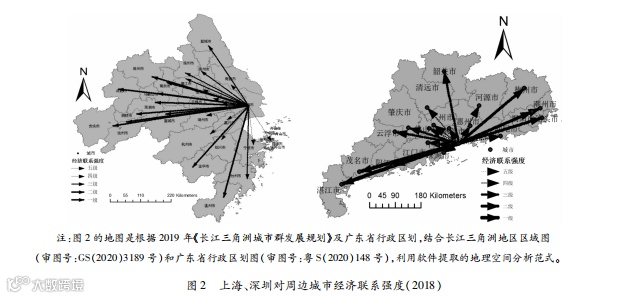 上海的经济辐射范围选取长三角城市群,根据2019年国务院发布的《长江三角洲城市群发展规划》,长江三角洲城市群包括上海、江苏、浙江和安徽等27个城市,深圳的经济辐射范围选取广东省内除深圳外的其余20座城市。