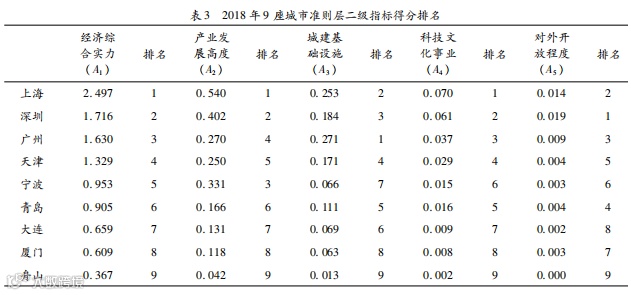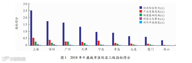 从以下图表可以得出:2018年,在经济综合层面、产业发展层面、科技文化层面,上海实力均处于首位;深圳在经济综合层面、产业发展层面和科技文化层面实力位居第二,在城建基础设施上排名第三,在对外开放程度层面位居第一。在城市综合实力层面,综合辐射力的排名依次为上海、深圳、广州、天津、宁波、青岛、厦门、大连和舟山;深圳作为经济特区,最近几年一直在赶超广州,但是在以往的分析中与广州仍然存在差距[13-15,17]。在综合辐射力层面,上海、深圳、广州依次排名前三,由此也可知上海与深圳在建设海洋中心城市方面存在较强的竞争力。
