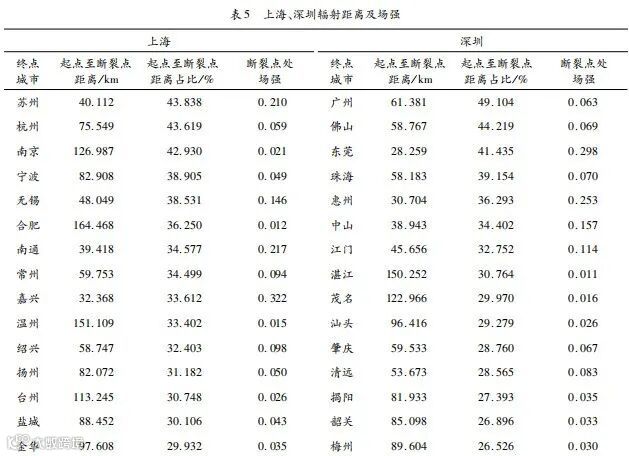 笔者计算整理了上海、深圳分别与长三角与广东区域内各城市之间的经济辐射范围,即断裂点范围及断裂点处的场强(见表 5),并且根据断裂点距离与总距离的占比进行排序,由表中结果可知,上海与长三角各城市断裂点距离占比大于 40%的有 3个城市:苏州、杭州、南京,占比 11%;介于 30%~40%的有11座城市,占比 40%。由此可见,上海对长三角区域城市的辐射力大小较均匀,差距不太大。深圳到广东各城市断裂点距离占比大于 40%的同样有 3个城市:广州、佛山和东莞,占比 14%;大于 30%小于40%的有 5座,占比为 24%。这说明深圳的辐射能力主要还是集中在珠三角区域,辐射范围相对来说不够均衡。从经济辐射的场强大小来看,上海对嘉兴的辐射场强最大,其次为南通、苏州和湖州,场强均大于 0.1;深圳在断裂点处的经济辐射大于 0.1,场强最大的为东莞,其次为惠州、汕尾、中山、河源。