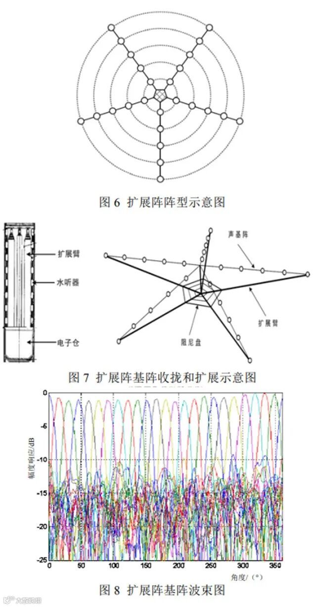浮标水平扩展阵主要用于多基地探测。美国浮标多基地探测在EER阶段采用被动定向浮标作为接收端,由于矢量水听器接收波束太宽,指向性不强,影响了多基地探测性能发挥,因此开发了AN/SSQ-101扩展阵浮标。其中一种扩展阵浮标声基阵由25个水听器组成,直径为R,25个基元均匀分布在圆周等角度的五个辐射轴线上,每个轴线为1根子阵,等间距分布5个水听器基元。每个子阵上的5个基元距圆心的距离依次为0.2R、0.4R、0.6R、0.8R和1.0R,如图6所示。基阵在收拢状态下,将子阵线缆进行折叠,放置在扩展臂的外侧;在展开状态下,通过扩展臂拉伸支撑成阵,如图7所示。采用体积阵优化波束形成技术[9],可形成25个水平接收波束,湖上实测波束图如图8所示。