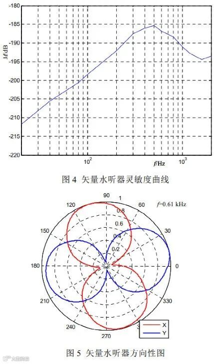 矢量水听器是被动定向浮标测量声场的关键部件,其本身具有正交的偶极子方向性,波束图为正弦函数,接收理论增益为4.8dB。矢量水听器低频灵敏度高,可保证低频性能。图4为某型浮标矢量水听器灵敏度曲线,图5为二维矢量水听器方向性图,由图可知偶极子具有良好的方向性、正交性、对称性和归零深度。