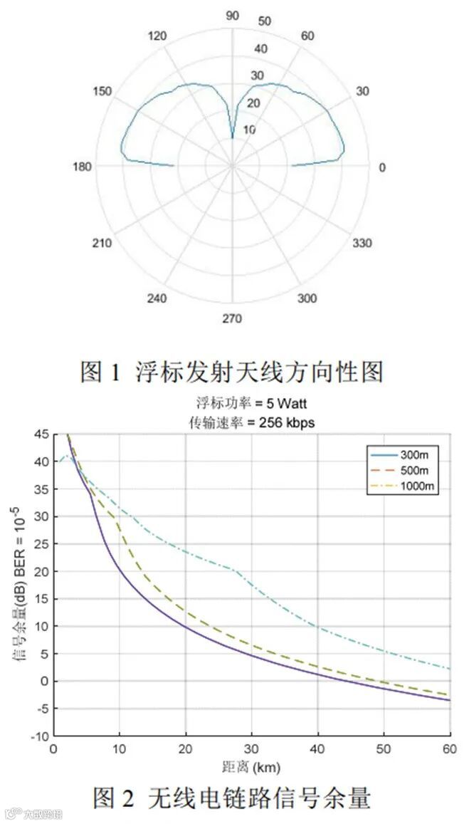 需要强调的是浮标在海面工作的发射方向性图同陆地工作有很大不同,在海面工作时由于海水是良好的导体,天线方向性图往上翘,飞机飞得高,无线电接收距离就远。图1为海上工作浮标发射天线方向性图,图2为飞机高度300m/500m/1500m,无线电链路信号余量图。