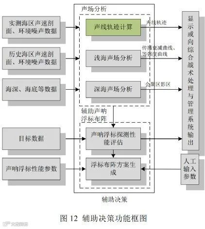 辅助决策模块由声场分析和辅助声呐浮标布阵两个部分构成(图12)。辅助决策模块运行在声呐信号处理机上,使用时,声呐员人工启动该项功能。辅助决策功能预留外部数据接口,可接入其他平台获取的遥感数据、历史温深数据、海洋环境数据,为后续拓展海洋环境重构提供支撑。