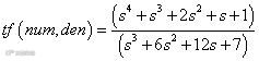 这里conv命令就是将分子分母的因式乘出来,然后按照s的幂次降序得到num 和den 两个一维矩阵,num=[1,1,2,1,1],den=[1,6,12,7]。再直观一点说,这时候