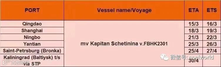 中国至新罗西斯克、圣彼得堡、加里宁格勒