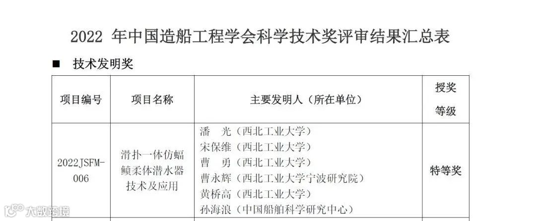 近期,2022年度中国造船工程学会科学技术奖评审结果公布,由西北工业大学、西北工业大学宁波研究院、中国船舶科学研究中心联合申报的《滑扑一体仿蝠鲼柔体潜水器技术及应用》项目荣获技术发明特等奖,这也是学会历史上的首个技术发明特等奖!
